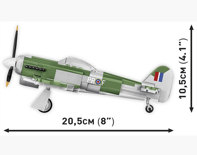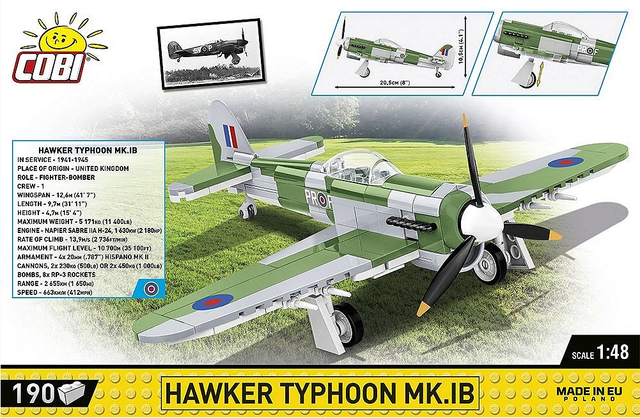 The Hawker Typhoon is a British fighter-bomber aircraft in service with the British RAF since 1941. Its main task was to combat German fighter aircraft as well as to support frontline operations by attacking ground targets. Typhoon was known for its high top speed of over 660 km/h and powerful armament, its speed made it ideal for performing low altitude intercepts against German Focke Wulf Fw 190s, which were untouchable due to their low-altitude speed.