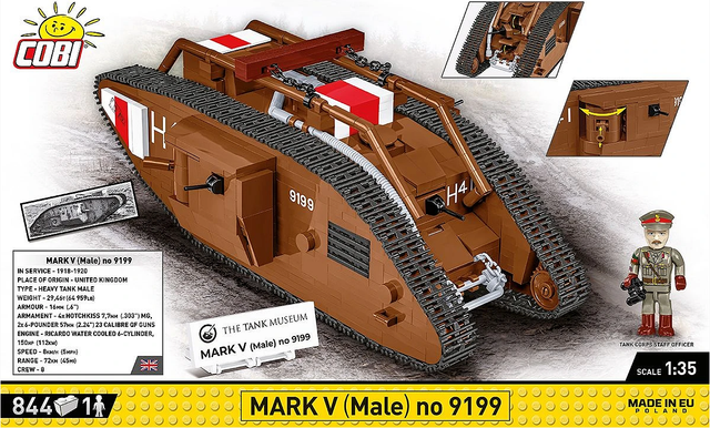 The tank is equipped with a working caterpillar traction, rotating cannons and opening hatches. The set includes a British officer figure and a plate with the name of the set and the logo of The Tank Museum.