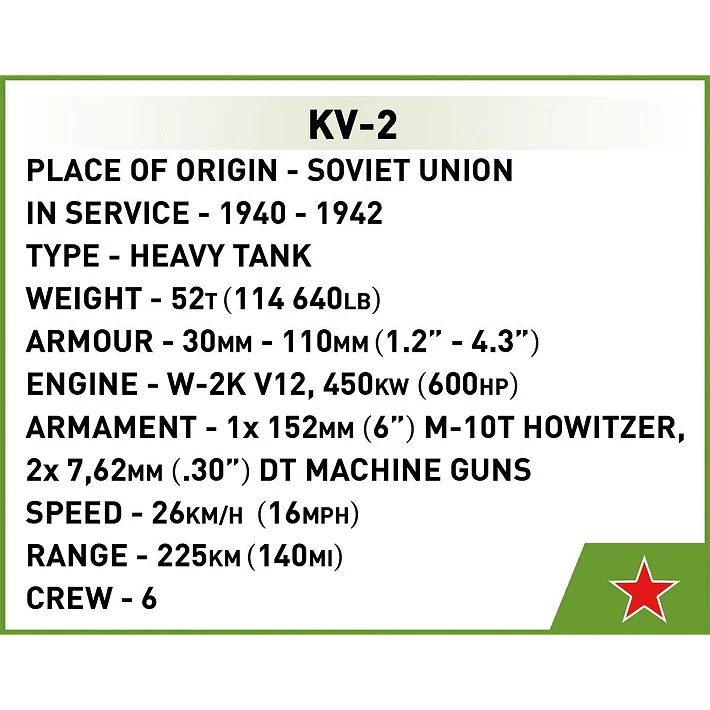 The block model of the Soviet heavy tank was designed in the scale of 1:48 using 510 elements. The blocks have high-quality prints showing vehicle details and markings. The KV-2 tank also has rotating wheels and tracks. The turret and tank gun are also movable. This COBI construction block model is the perfect purchase for any fan of history, military technology or any fan of block modelling! Perfect for both fun and serious collecting! The KV-2 adds to the ever-expanding collection of World War II tanks released in a compact 1:48 scale. Build history, piece by piece, with COBI!