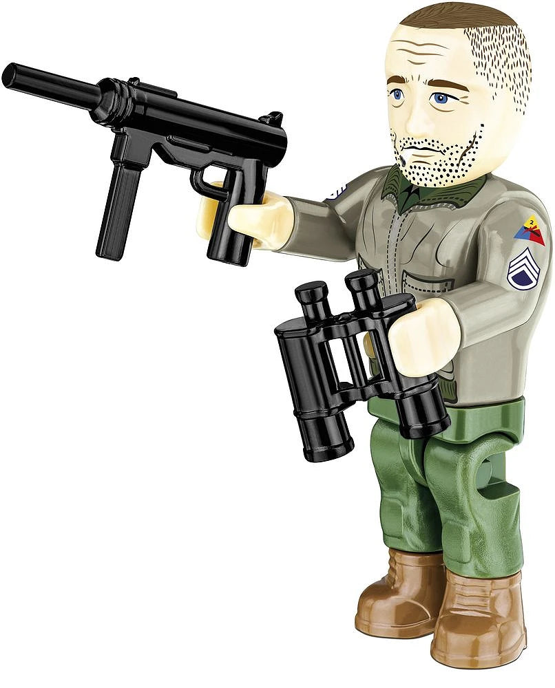 The COBI block-based Sherman was produced in a large scale 1:28, which allows more details to be reproduced! The tank has a movable cannon, a rotating turret, an opening hatch and a working track system. All graphic details are high-quality prints that do not wear off even during intense play. The advantage is the design that uniquely reflects the original shapes of its historical inspiration. There are additional accessories on the tank that recreate the vehicle's and can be used by minifigures representing the tank's crew. Particularly noteworthy is the perfectly reproduced figure of the tank commander, in which you can see a hero worthy of the best war movies. The whole set is completed by a plate with the name of the tank printed on it.